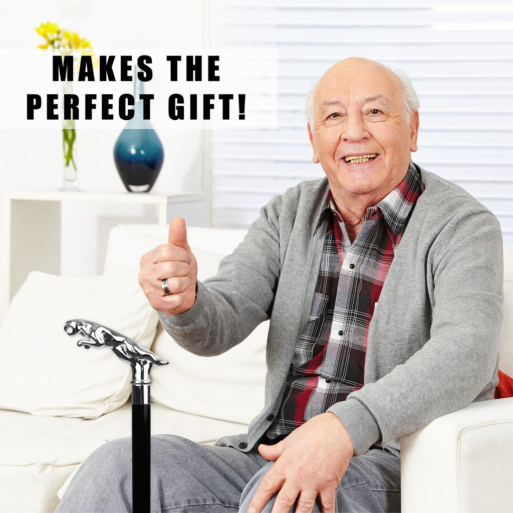 - BOLD SILVER JAGUAR EMBLEM HANDLE – Combines comfort and flair, making it part of our fashionable elderly assistance products line of wood canes and walking sticks for seniors.