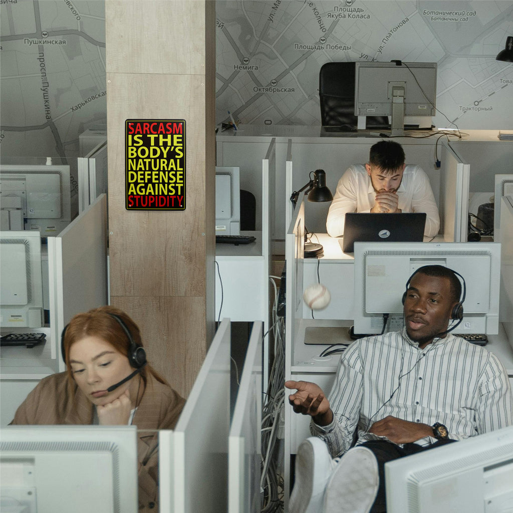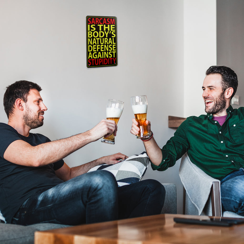 Sarcasm is not just an art—it’s survival. Our “Sarcasm Is the Body’s Natural Defense Against Stupidity” sign says what we’re all thinking and does it with vintage flair. Whether you're trying to survive your coworkers, roommates, in-laws, or just the general public, this funny metal wall decor is the perfect way to set the tone without saying a word. It’s the ideal gag gift for men who appreciate clever humor, and it fits right into any man cave, garage, apartment, dorm room, or office desk space. Designed as a retro tin sign, it blends sarcasm with style and delivers a bold message that earns smirks and nods of agreement. Lightweight and easy to hang, the 12"x8" size is perfect for small areas that need a little extra personality and a healthy dose of wit. From college students dodging dumb questions to office warriors warding off nonsense and eye-rolling moments, this funny wall art fits anywhere a little comic relief is needed. Because let’s be honest—sarcasm might not fix stupidity, but it sure makes it more bearable to witness on a daily basis.