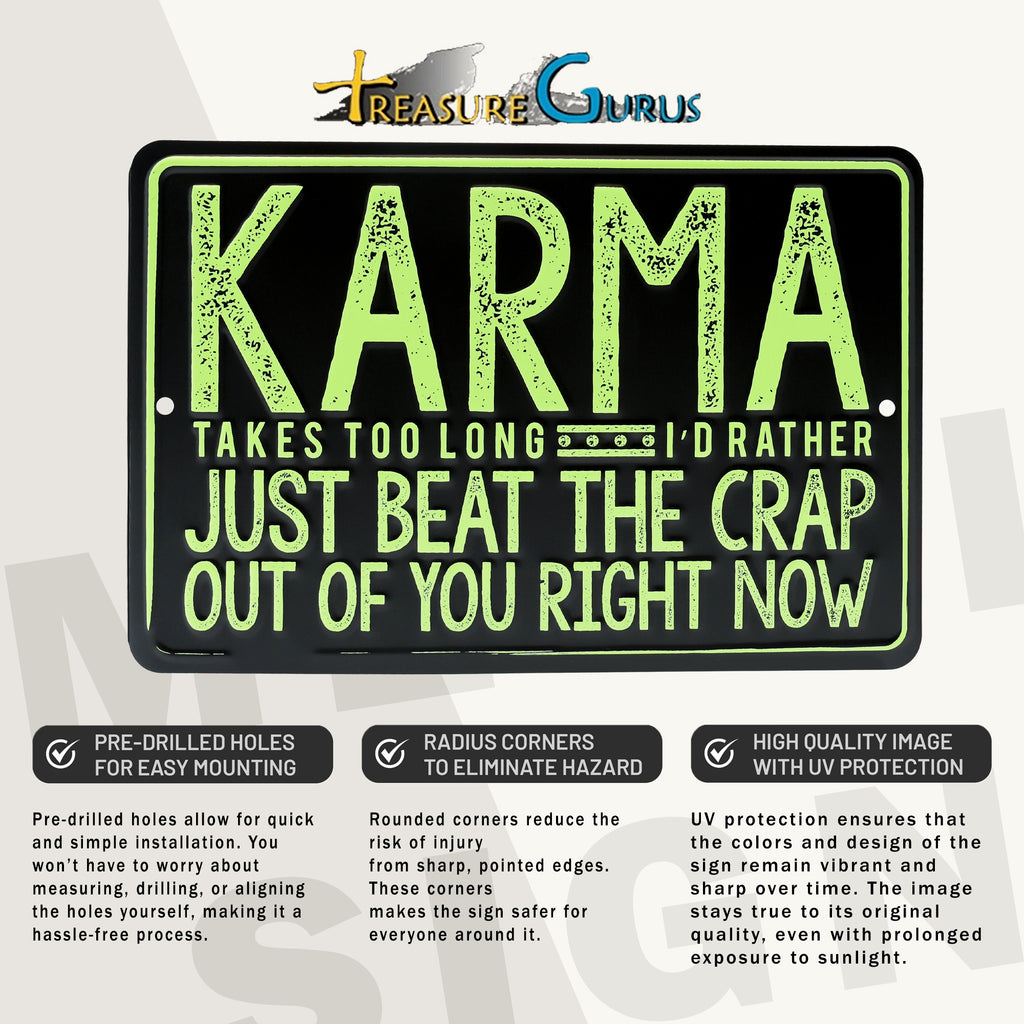 - HILARIOUS VINTAGE METAL WALL SIGN – Karma Knock The Crap Out of You brings bold humor to man cave, garage, home, and room decor for guys who love funny wall art and tin signs