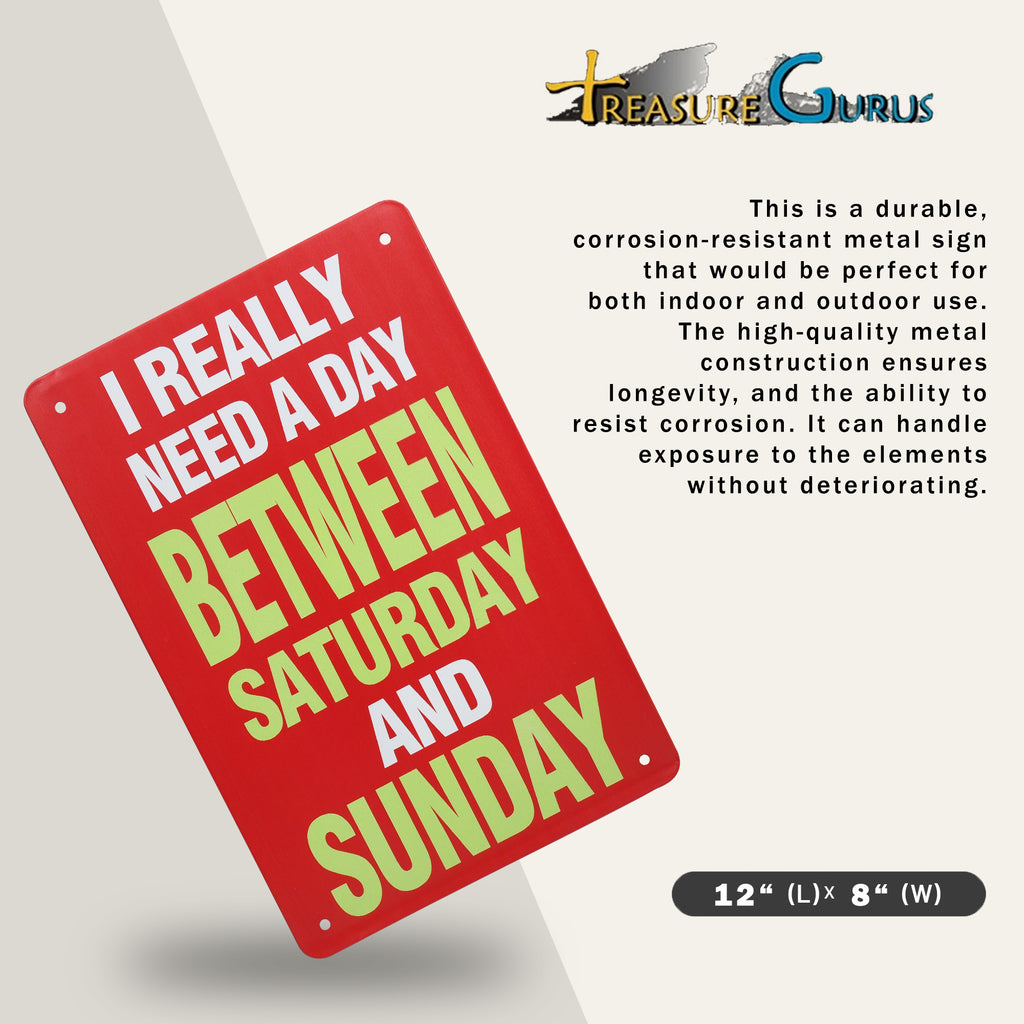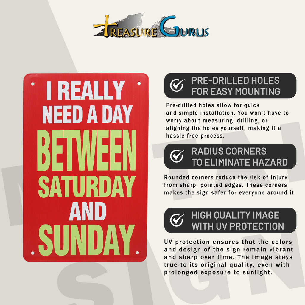 Metal Funny I Need A Day Between Saturday and Sunday Sign Features:
