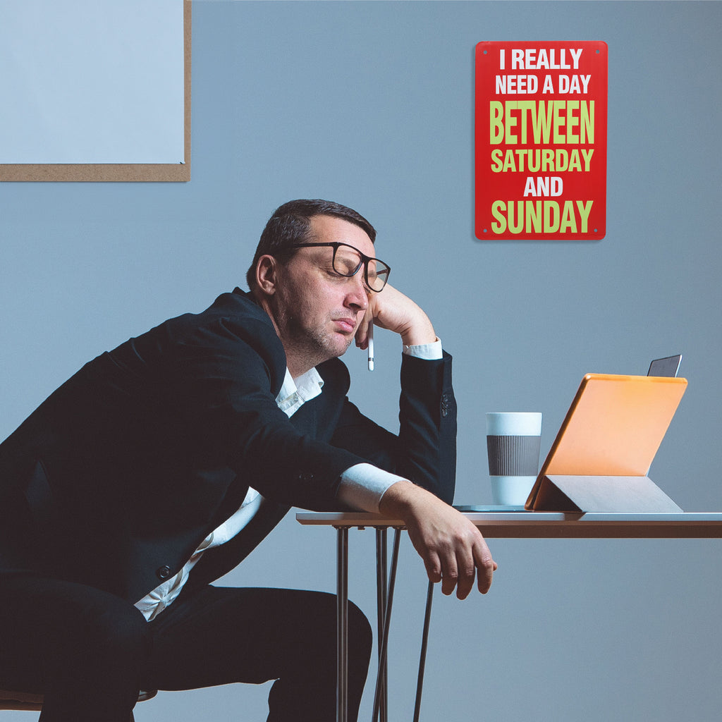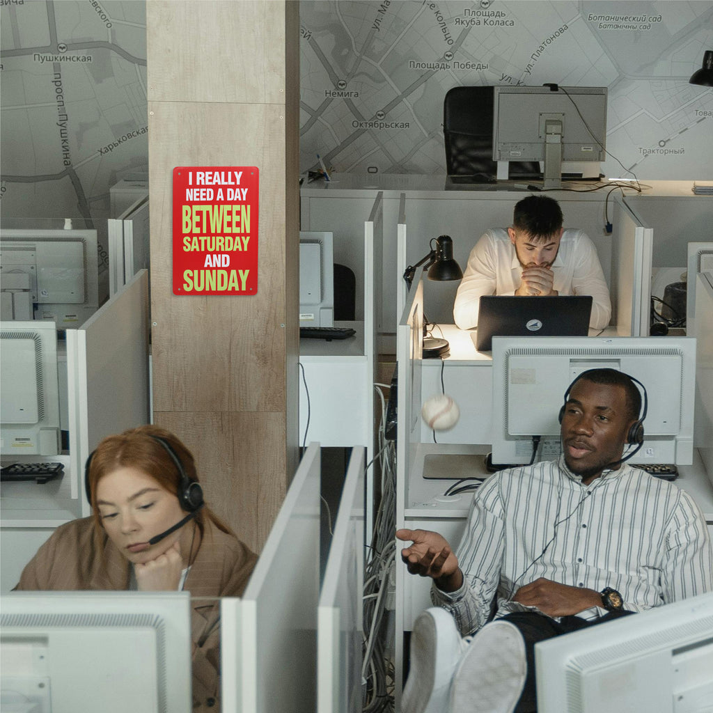 - FUNNY METAL WALL DECOR SIGN – I Need a Day Between Saturday and Sunday sign brings humor to dorm room decor, bedroom decorations, and office desk accessories