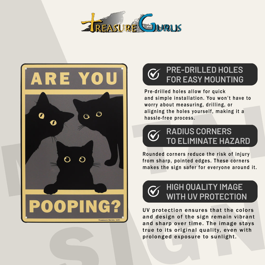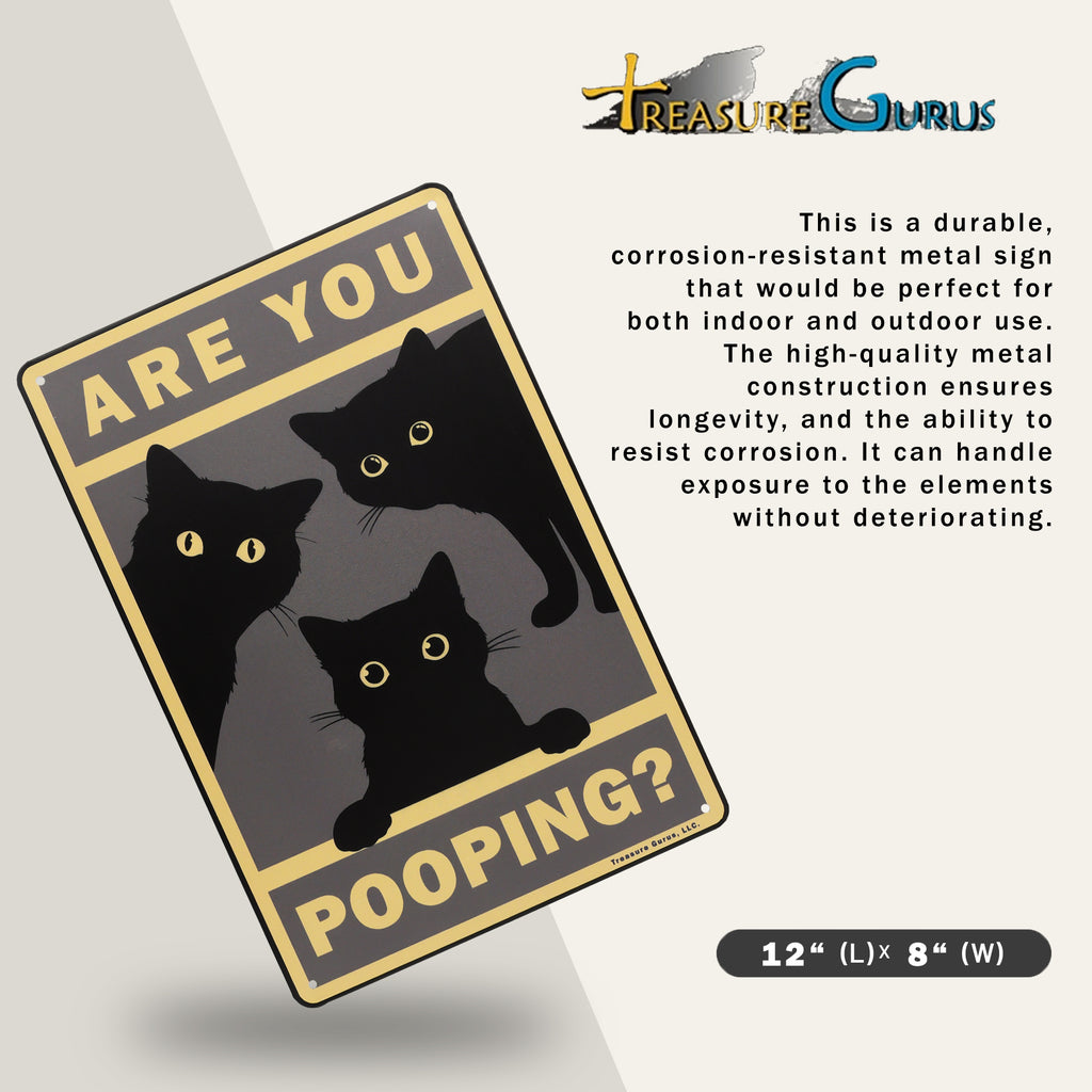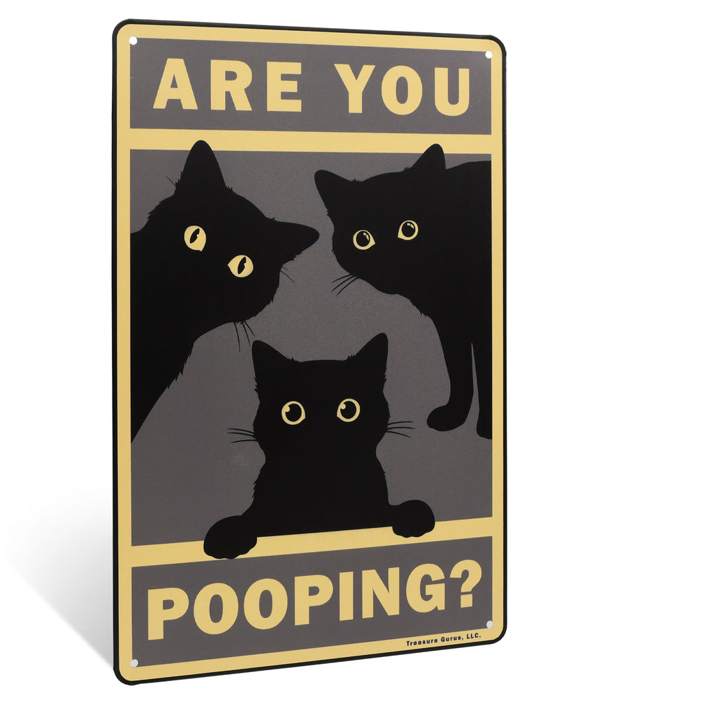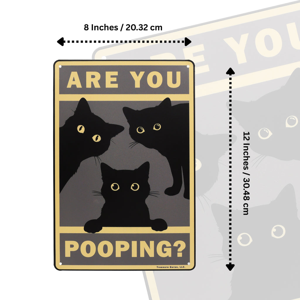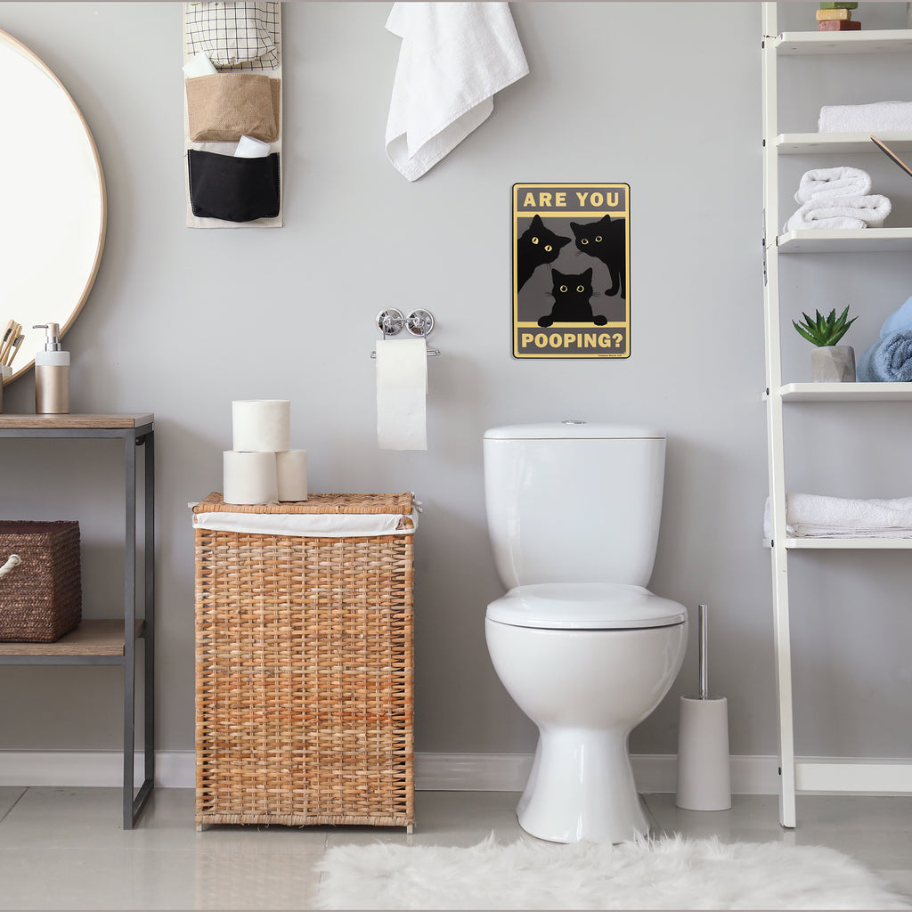 You know that feeling of being watched? With this “Are You Pooping?” sign, you're not imagining it. A sneaky black cat is peeking in, eyes wide with curiosity—because of course, cats must investigate *everything*, even your bathroom time. This funny bathroom decor captures the essence of cat behavior: nosy, adorable, and totally unapologetic. With its vintage black cat poster style and rustic farmhouse home metal wall decor charm, it’s a lighthearted piece that fits perfectly in any bathroom setting. Whether you’re outfitting your guest bath, powder room, or master loo, this sign brings a dash of feline fun to your space. It's the purr-fect cat bathroom decor choice for feline fanatics who love cute prints and want to add a little personality to their walls. This sign makes an ideal gift for cat lovers or anyone who appreciates the humorous side of bathroom home decor. Durable, lightweight, and ready to hang, this 12"x8" sign reminds everyone—yes, the cat is judging you, and she’s not even sorry.