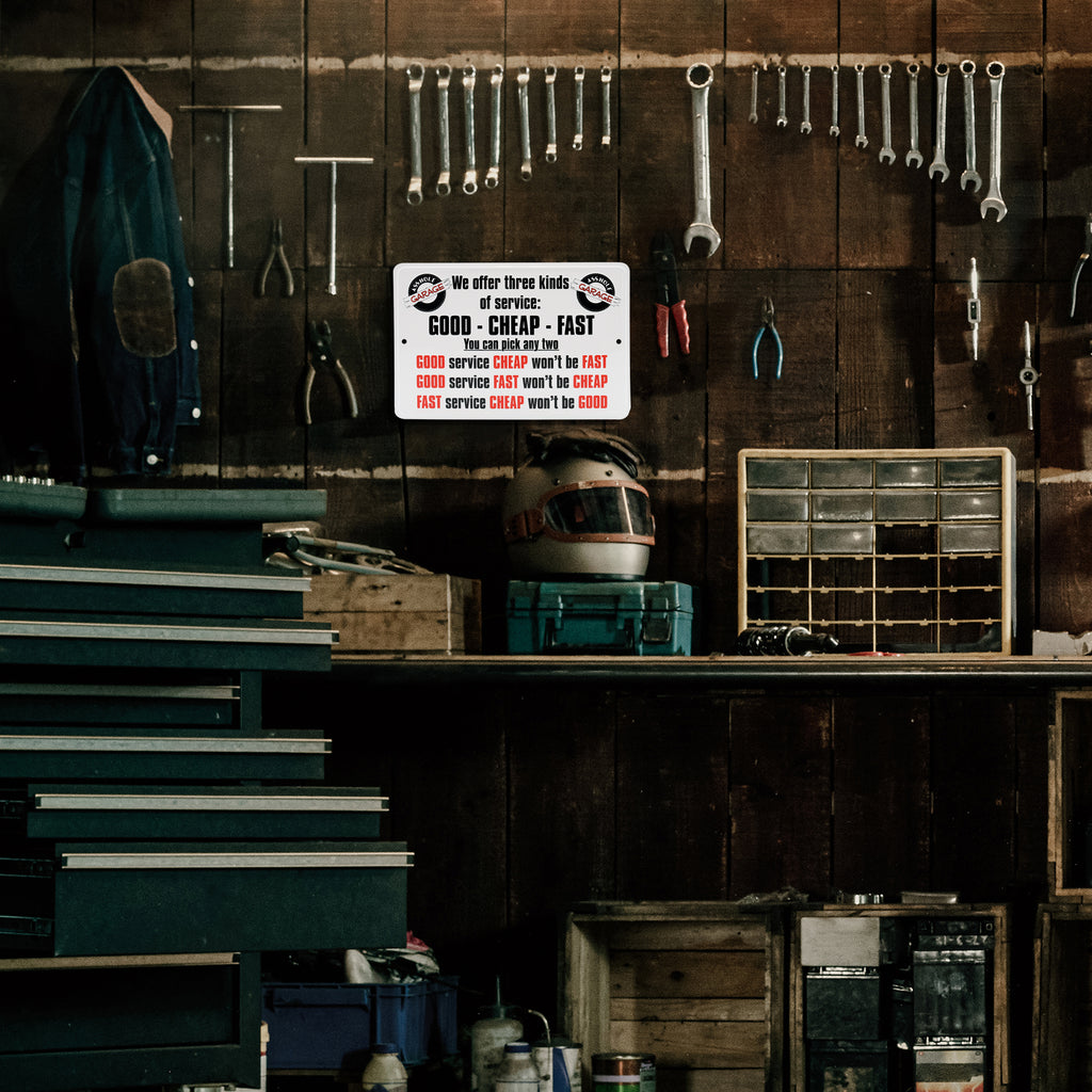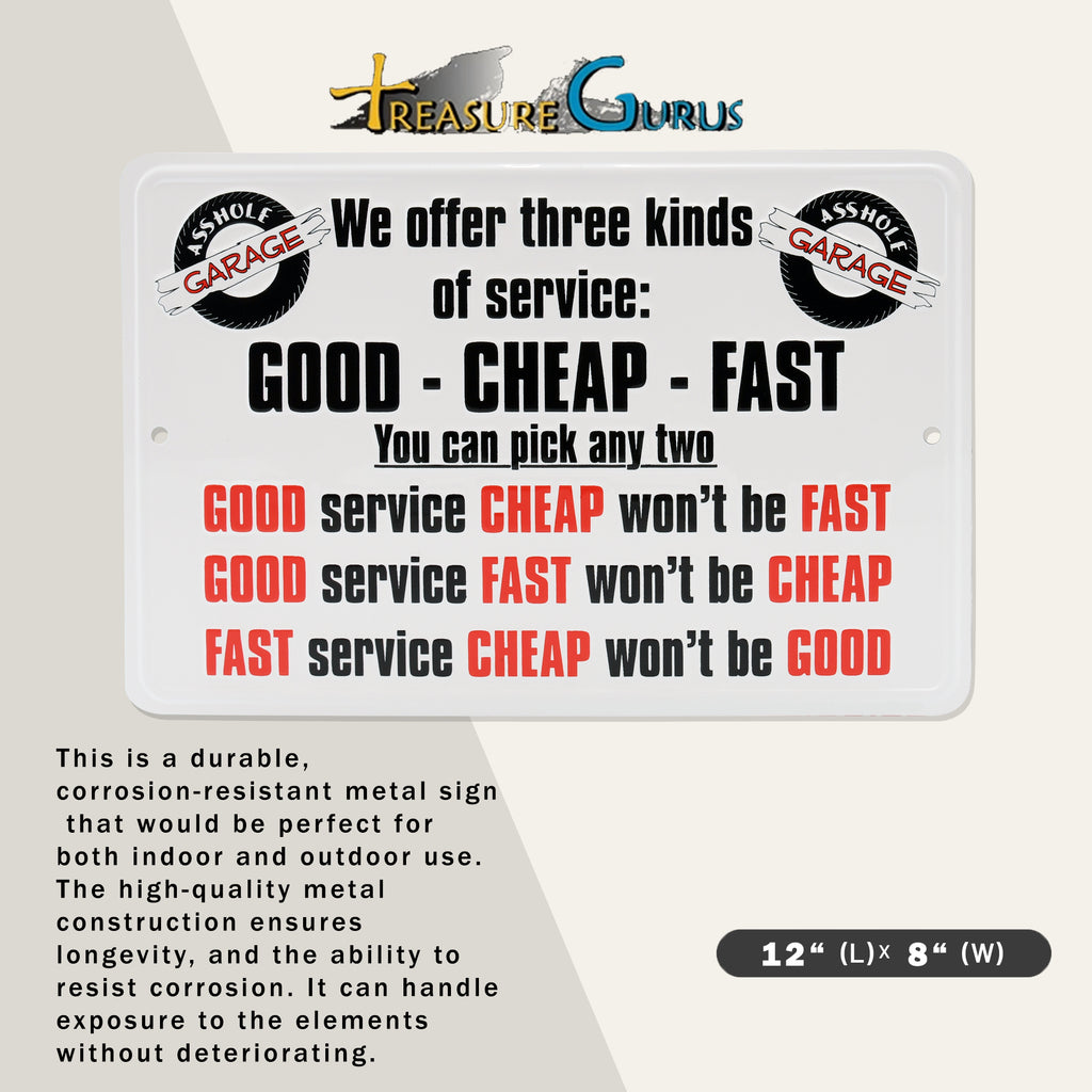 If your mechanic shop runs on sarcasm, sweat, and a touch of chaos, this “We Offer 3 Kinds of Service” funny metal garage wall sign was made for you. With a bold retro design and a punchline every wrench-wielder will appreciate, it brings personality and laughter to any workspace that smells like oil and hard-earned experience. Perfect for man cave setups, mechanic shop decor, or anywhere you want to show your no-nonsense approach to customer service, this vintage tin sign is as much wall art as it is a reality check. Whether you’re setting up a new bay, reworking your room decor, or just need some good garage humor, this wall sign delivers the laughs and attitude. Made of high-quality metal and designed to mimic old-school shop posters, it also makes a great pick for gifts for men who live under the hood, tinker in their garage, or collect unique automotive accessories. Add it to your collection of funny posters, tin signs, or vintage wall art—it’s a small sign with big mechanic energy. Measuring 12" long by 8" wide, it’s just the right size for garages, man caves, or shop walls. Lightweight and easy to hang, it’s a great way to complete your collection of cool gifts for men, mechanic birthday gifts, or wall decor that speaks fluent sarcasm.