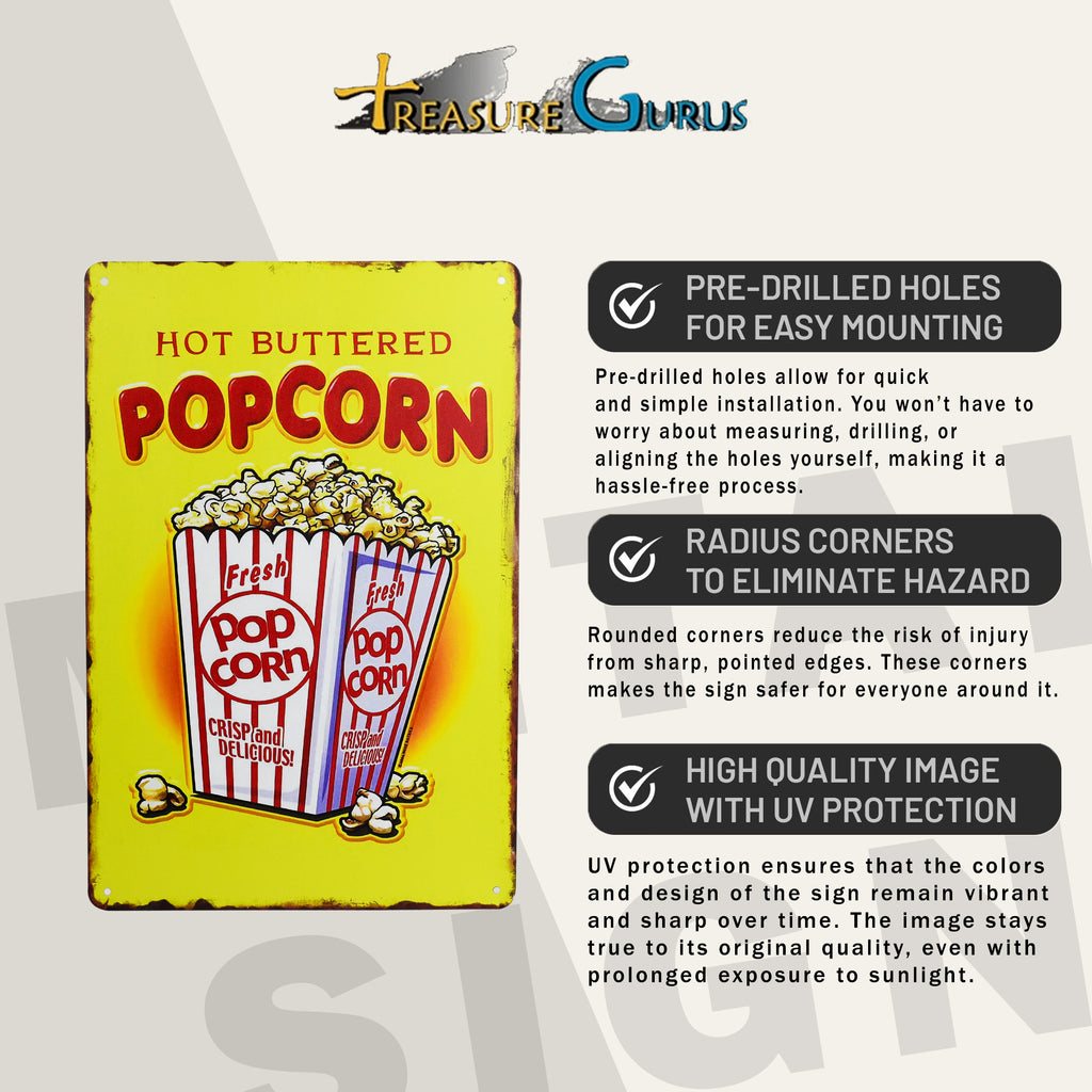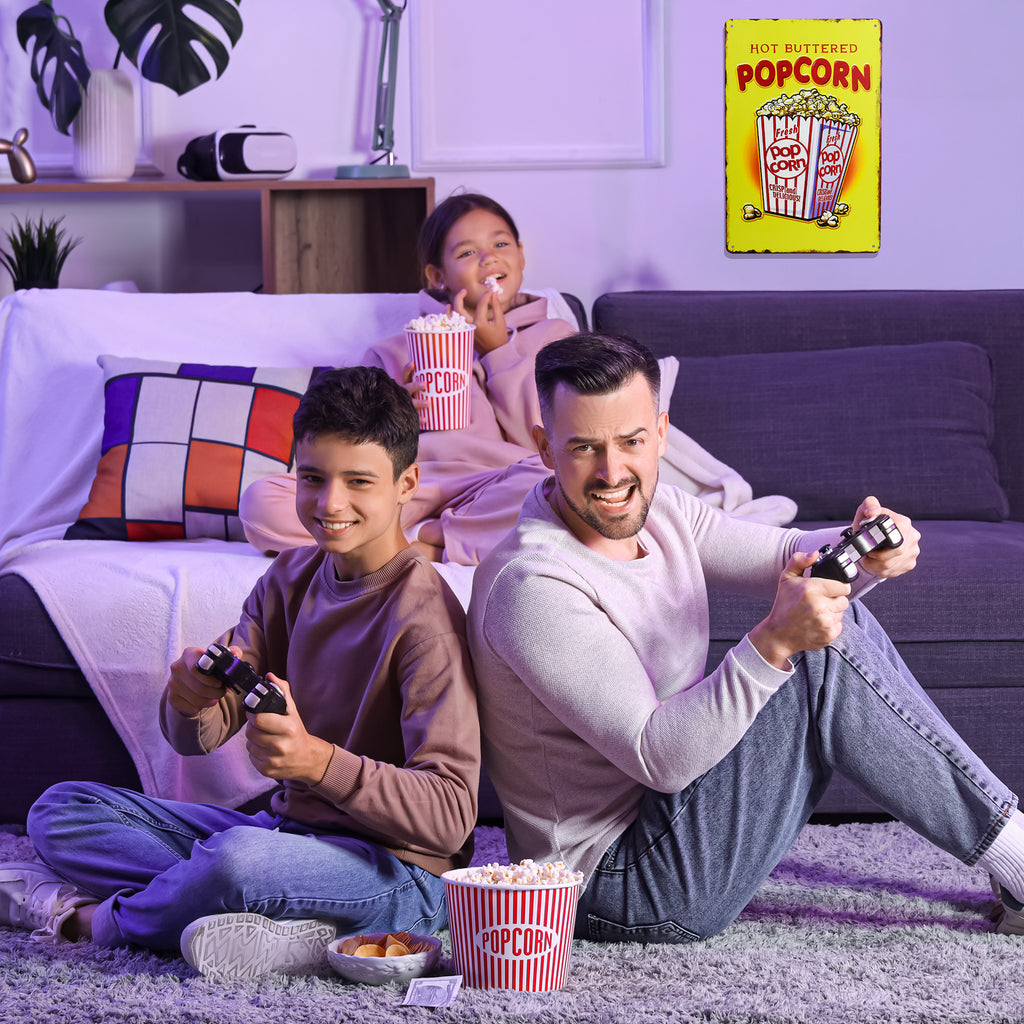 - PLAYFUL POPCORN WALL ART - Our hot buttered popcorn sign brings retro metal wall art and popcorn snack poster fun to concession stand, movie theater, or home theater room decor