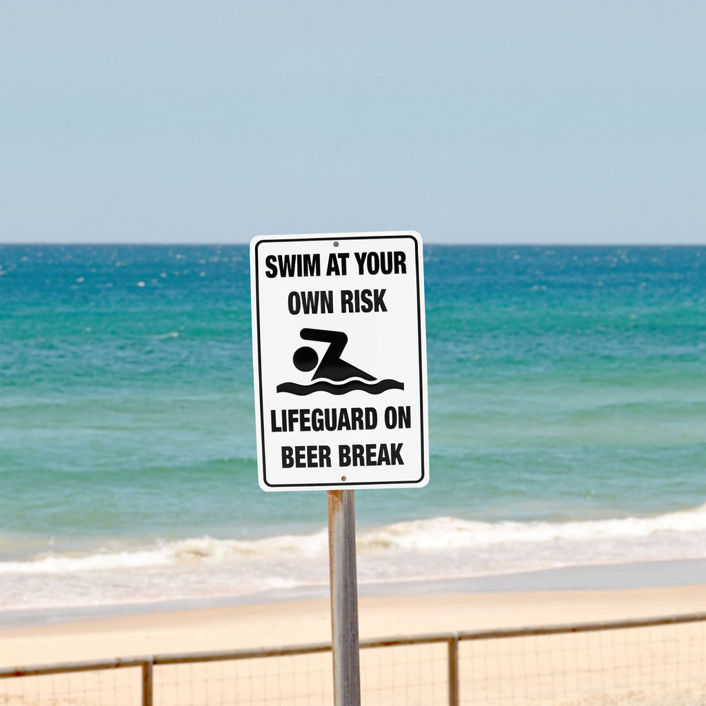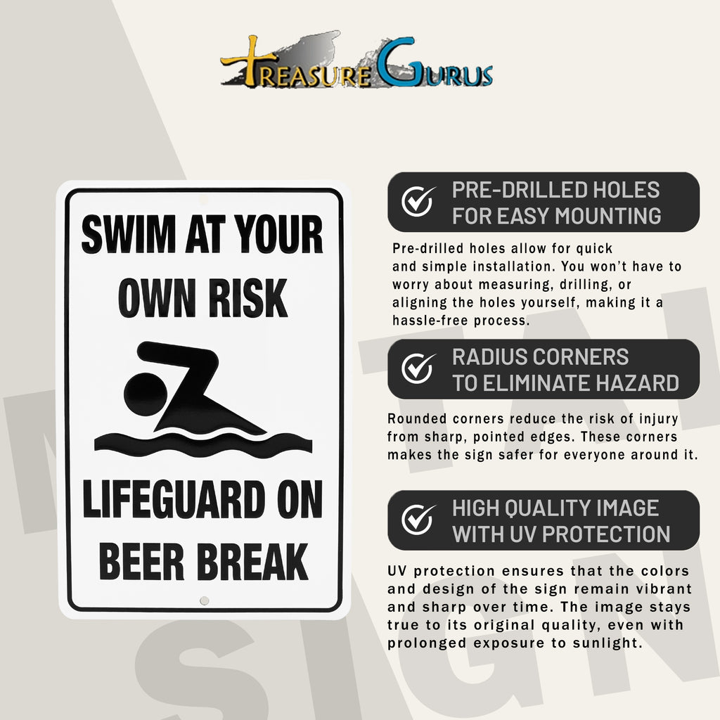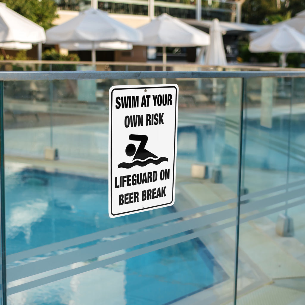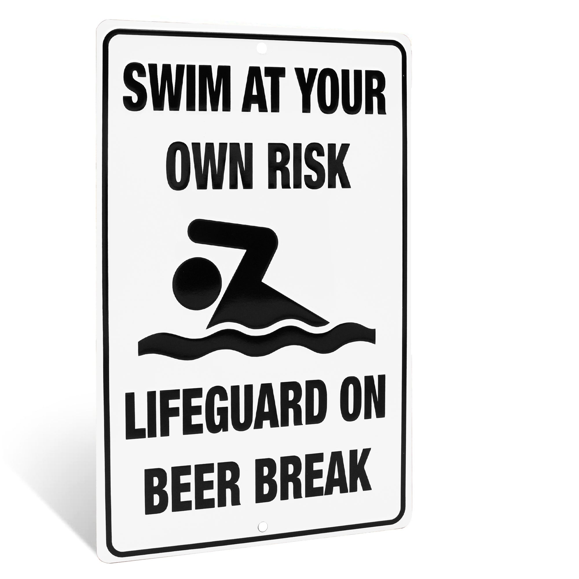 - FUNNY METAL SIGN FOR POOL PARTY DECOR – Funny metal signs like “Swim At Own Risk Lifeguard On Beer Break ” are the ultimate pool party decorations for summer and outdoor fun